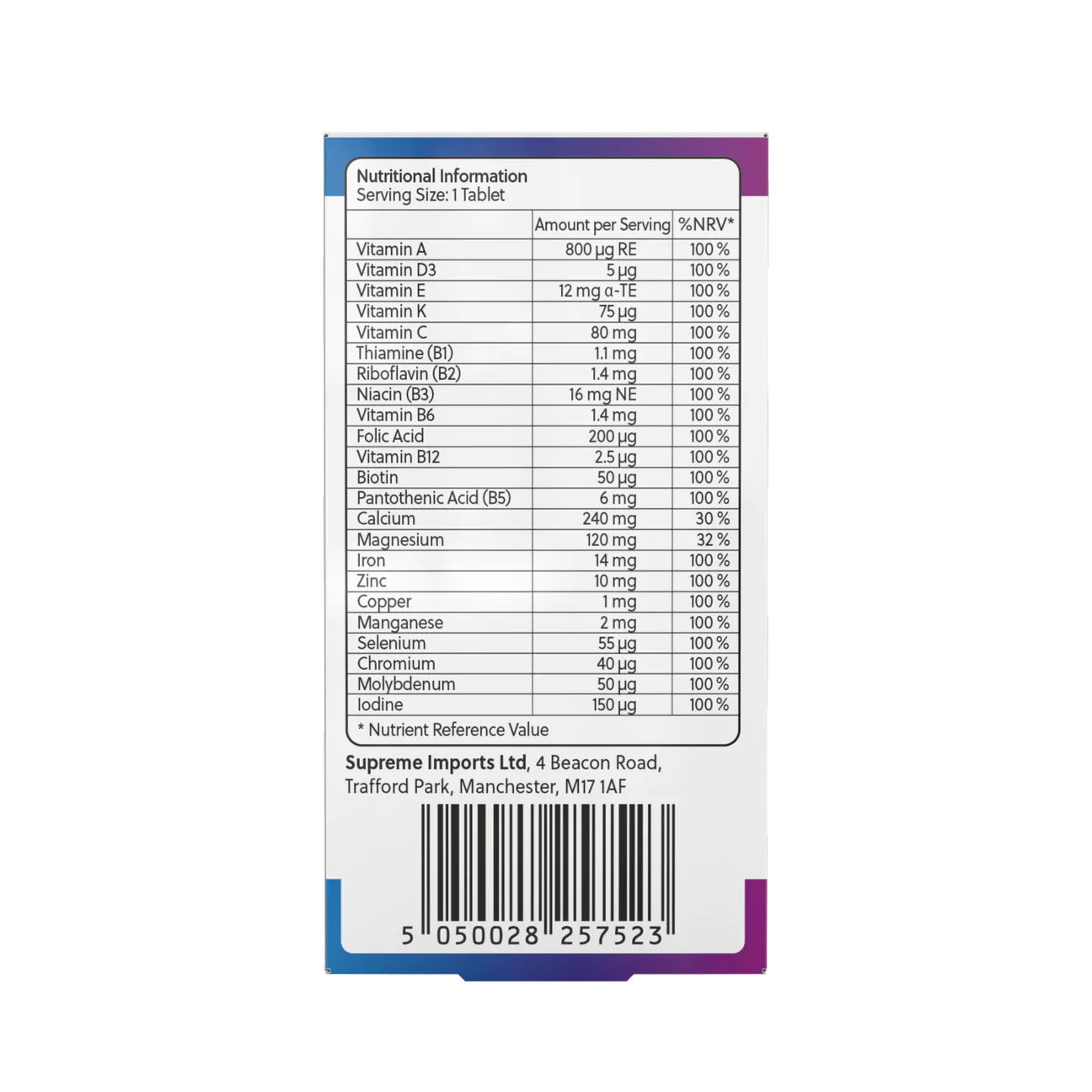 This comprehensive formula provides 100% NRV for all 13 vitamins, helping to maintain a healthy immune system, strong bones and teeth, and normal energy production.