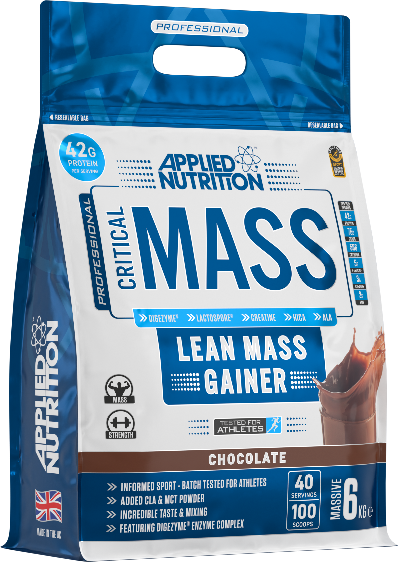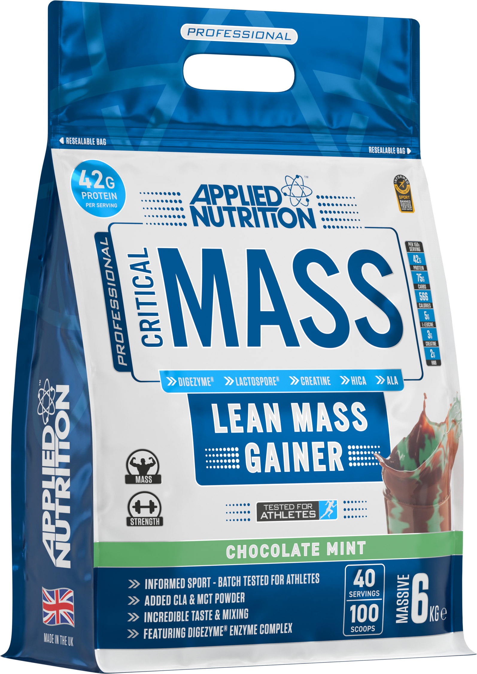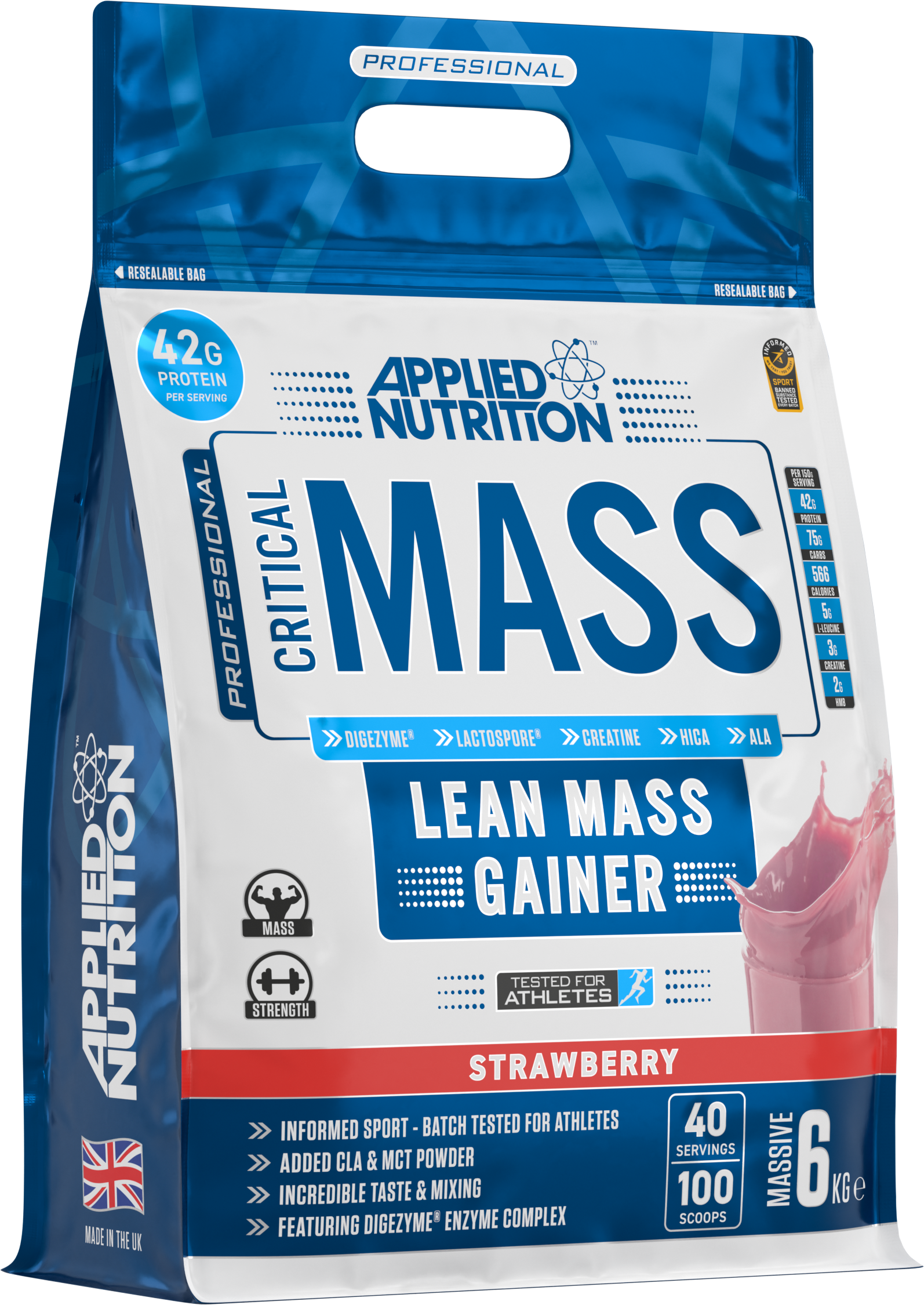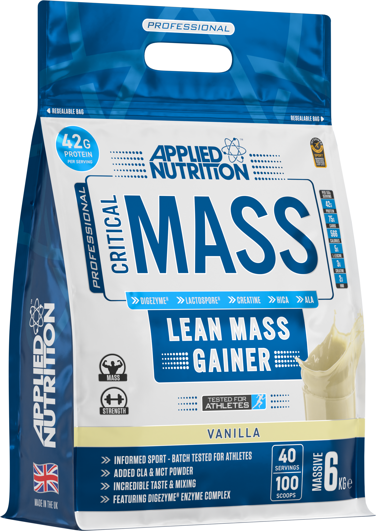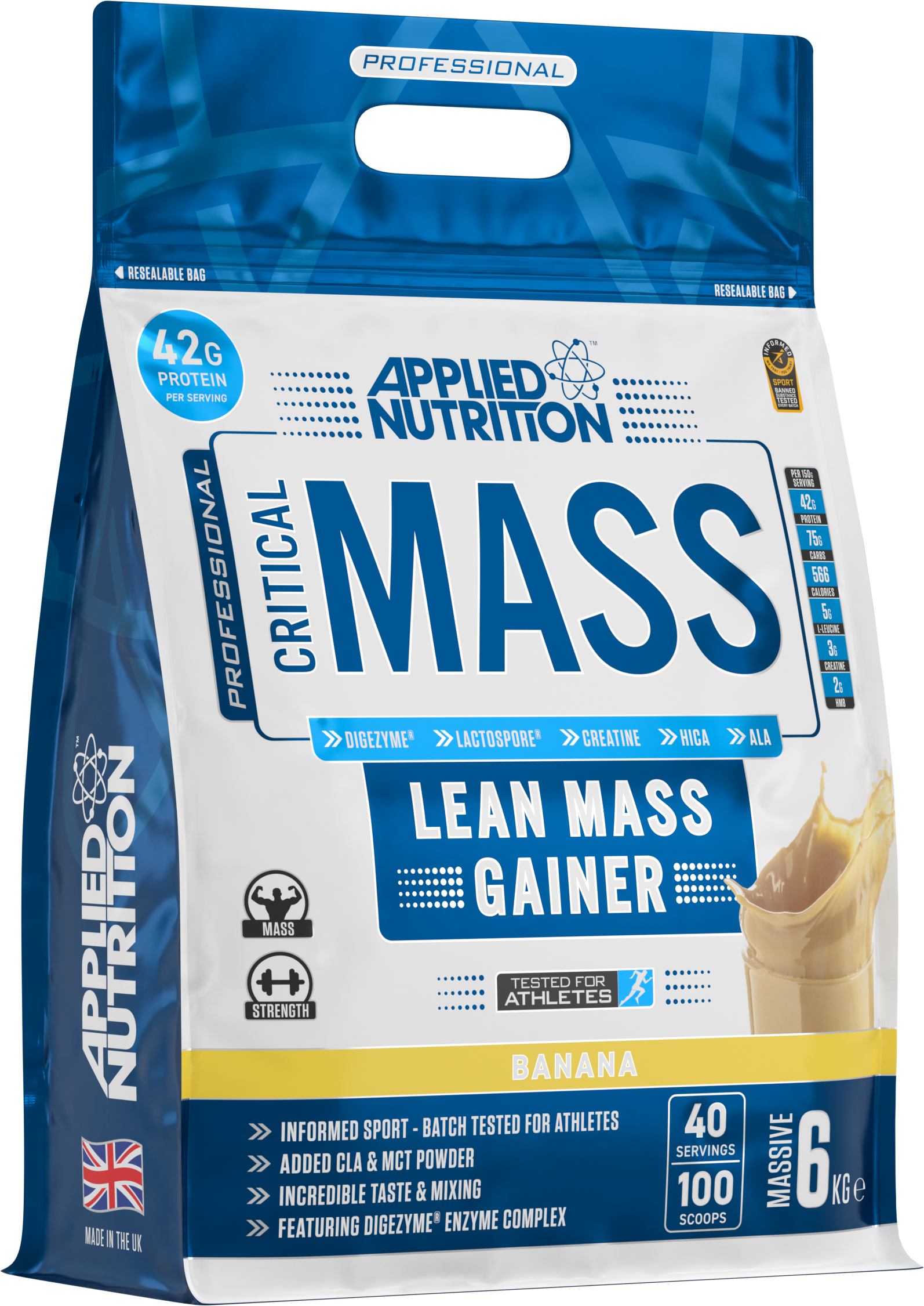Mix 2.5 scoops (150g) with 500ml of water or skimmed milk and shake well using a shaker bottle. Consume 1-3 servings daily depending on your calorie requirements. Critical Mass is a carbohydrate dense shake and pairs perfectly with Applied Nutrition’s GDA (Glucose Disposal Agent) iDRIVE™ insulin driver.