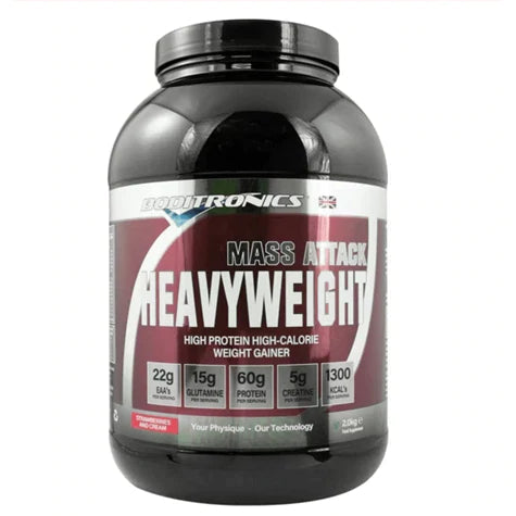 Containing a massive 60g of muscle-building protein, together with quality complex carbohydrates and medium chain triglycerides (a fat that is processed in the body like a carbohydrate). Mass Attack Heavyweightpacks a monster 1300 calories per serving when mixed with water (more if mixed with milk).