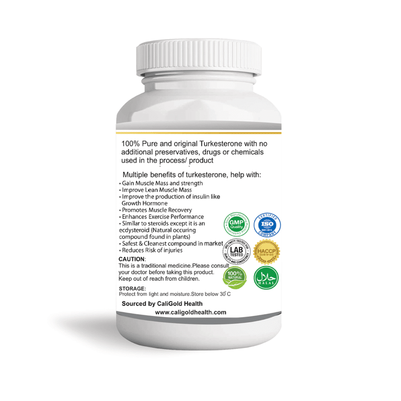 Turkesterone, the natural, plant-based supplement that is taking the fitness world by storm. Made from a specific type of plant, Ajuga turkestanica, Turkesterone contains ecdysteroids, compounds that have been scientifically studied for their anabolic and metabolic benefits. Turkesterone is designed to help you achieve your fitness and wellness goals, whether you are an elite athlete, a weekend warrior, or simply someone looking to support your overall health and well-being. Our supplement is carefully formulated to provide a standardized dose of turkesterone, ensuring that you get the full benefits of this powerful compound with every serving. The potential benefits of turkesterone are impressive, and our customers have reported significant improvements in muscle growth, strength, and endurance. Turkesterone may also help support healthy cognitive function, reduce stress, and enhance metabolic function. At CALIGOLD HEALTH, we are committed to providing the highest-quality supplements available, and Turkesterone is no exception. Our supplement is made with only the finest natural ingredients, and we use rigorous testing and quality control procedures to ensure that our customers receive only the best. So if you’re looking for a safe, natural, and effective way to enhance your athletic performance, improve your health, and support your overall well-being, look no further than Turkesterone. Try it today and see the difference for yourself!