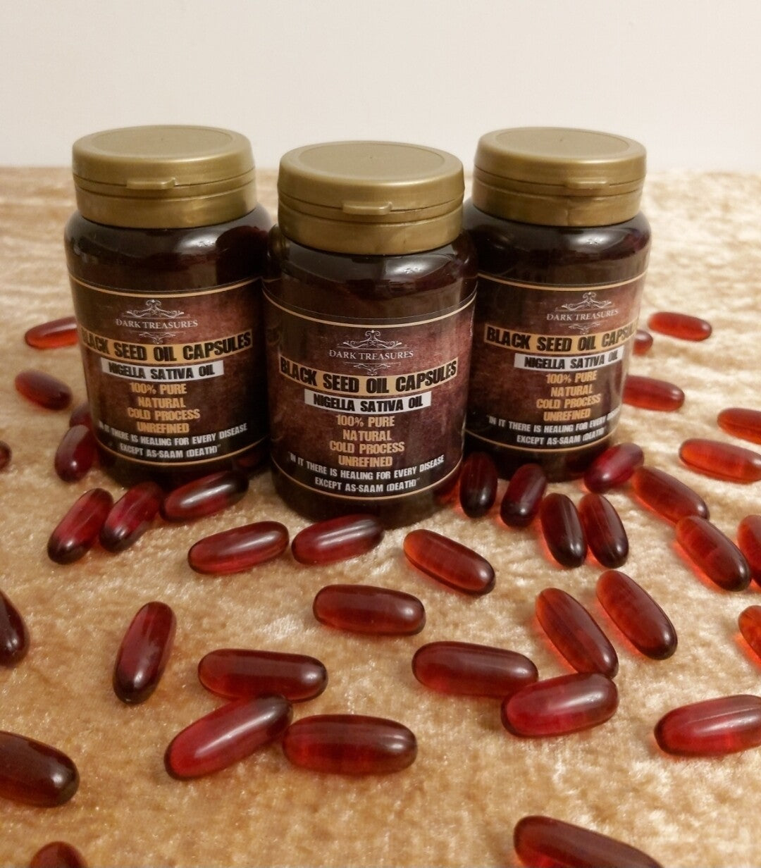 Dark Treasures, pure, Grade A, 100% natural, cold pressed, extra virgin and unrefined black seed oil capsules.
