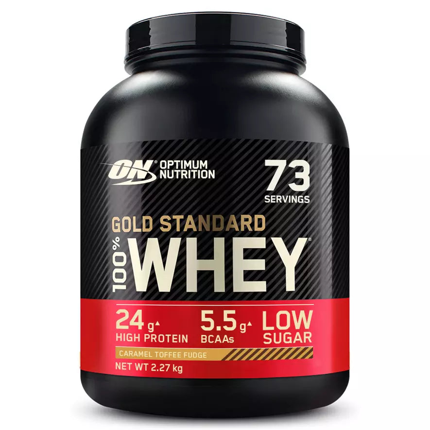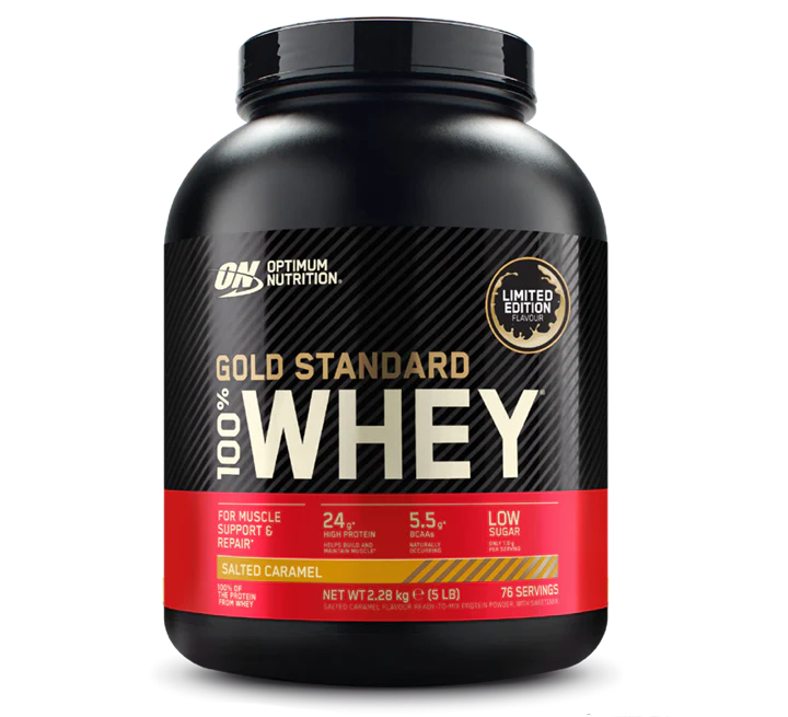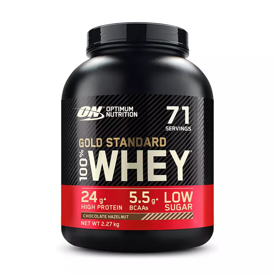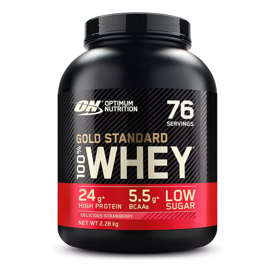 Optimum Nutrition's GOLD STANDARD 100% WHEY is the world’s best-selling whey protein. It delivers 24 g of whey protein to support muscle growth. After training, your body uses protein to help repair and rebuild muscle fibres. Each great tasting serving contains 24 g of premium whey protein to support muscle growth and 5.5 g of naturally occurring BCAAs. All with just 1.4 g of fat, 0.7 g of sugars, and with 1.3 g of carbs.