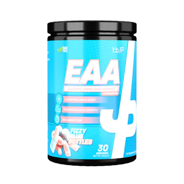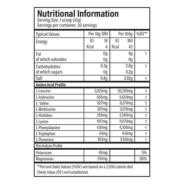 Essential Amino Acid Blend (Leucine, Isoleucine, Valine, Lysine, Threonine, Phenylalanine, Methionine, Histidine, Tryptophan), Acidity Regulator (Citric Acid), Sodium Bicarbonate, Flavouring, Magnesium Oxide, Potassium Chloride, Sweetener (Sucralose), Salt, Colouring (E133*).